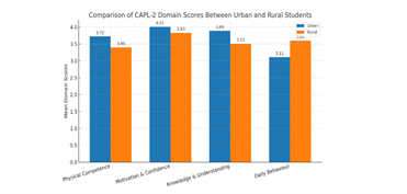 Figure 2 provides a concise visual summary of the key comparative findings across the four domains of physical literacy assessed by the CAPL-2 tool. The figure distinctly illustrates that urban students outperform their rural counterparts in physical competence, motivation and confidence, and knowledge and understanding. These differences align with the quantitative results presented in Table 2 and suggest that urban school environments may offer greater access to structured physical education, trained personnel, and informational resources. Conversely, the figure highlights that rural students score higher in daily behaviour, indicating more frequent engagement in unstructured physical activities such as walking, cycling, and outdoor play. This contrast suggests that although urban students may possess higher perceived competence and theoretical understanding, rural students may be more physically active in daily life. The figure thus encapsulates the nuanced rural–urban dichotomy in physical literacy development, reinforcing the need for context-sensitive educational and health promotion strategies.