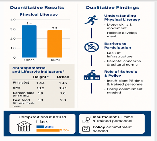 Data Analysis This study employed a mixed-methods approach, integrating quantitative and qualitative data to examine the relationship between physical literacy, physical activity, and lifestyle-related health indicators among rural and urban schoolchildren in Punjab and Haryana. Data were analyzed in two phases using IBM SPSS Statistics (Version 25.0, IBM Corp., and Armonk, NY, USA) for quantitative data and thematic content analysis for qualitative responses.
